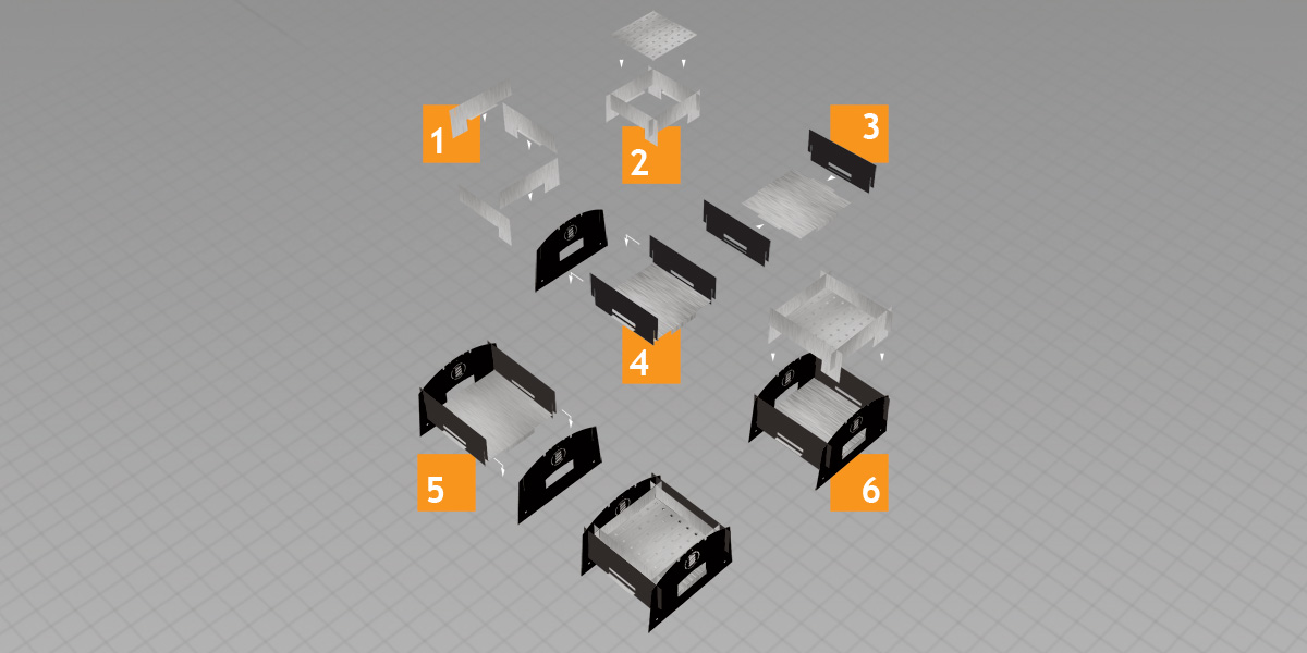 Vegye ki a dobozból a tűztér 4 oldalát. Illessze össze az oldalakat úgy, hogy egy négyzetet formáljanak 1. Figyeljen arra, hogy a felhajtott “fülek“ a négyzet belsejébe kerüljenek!